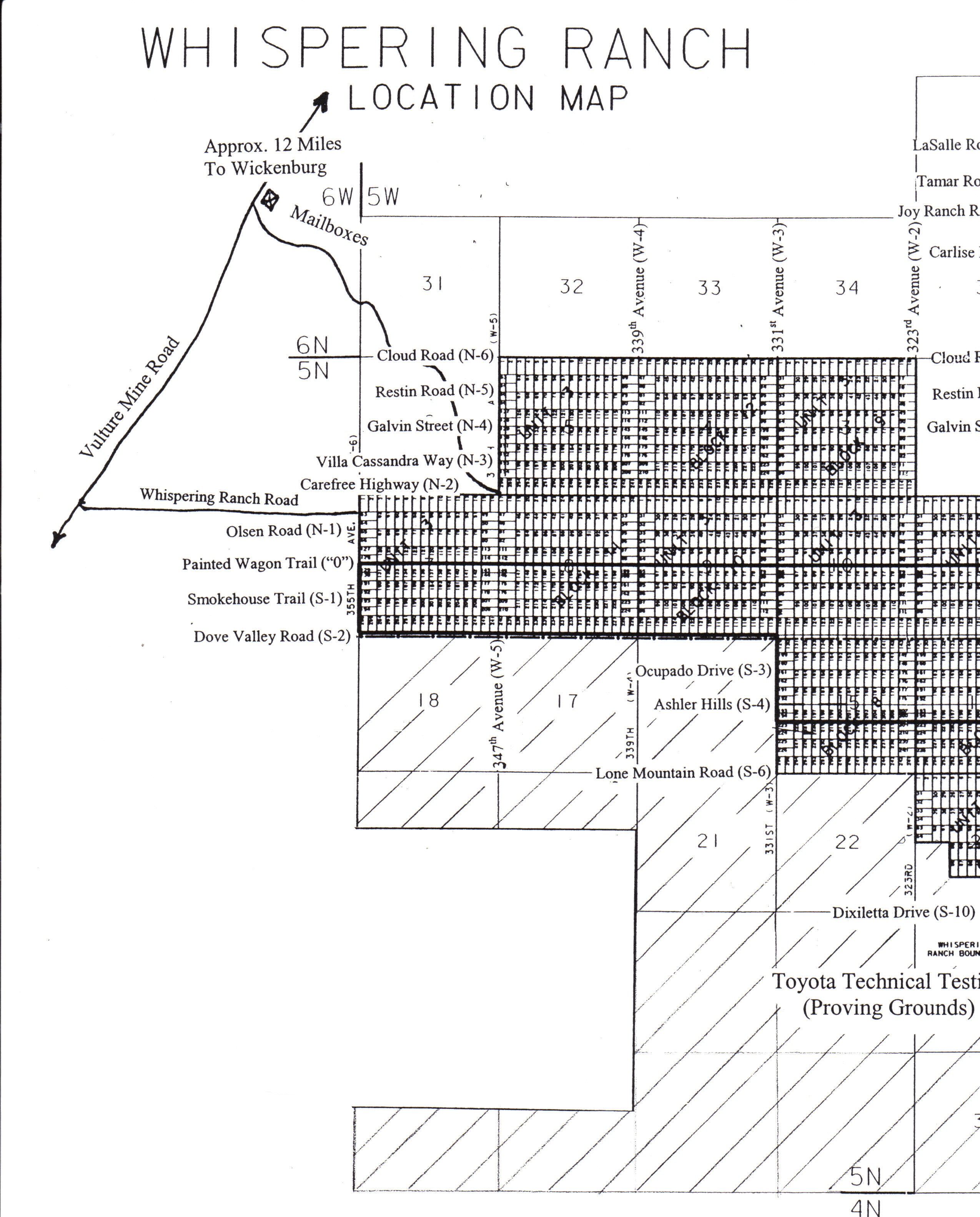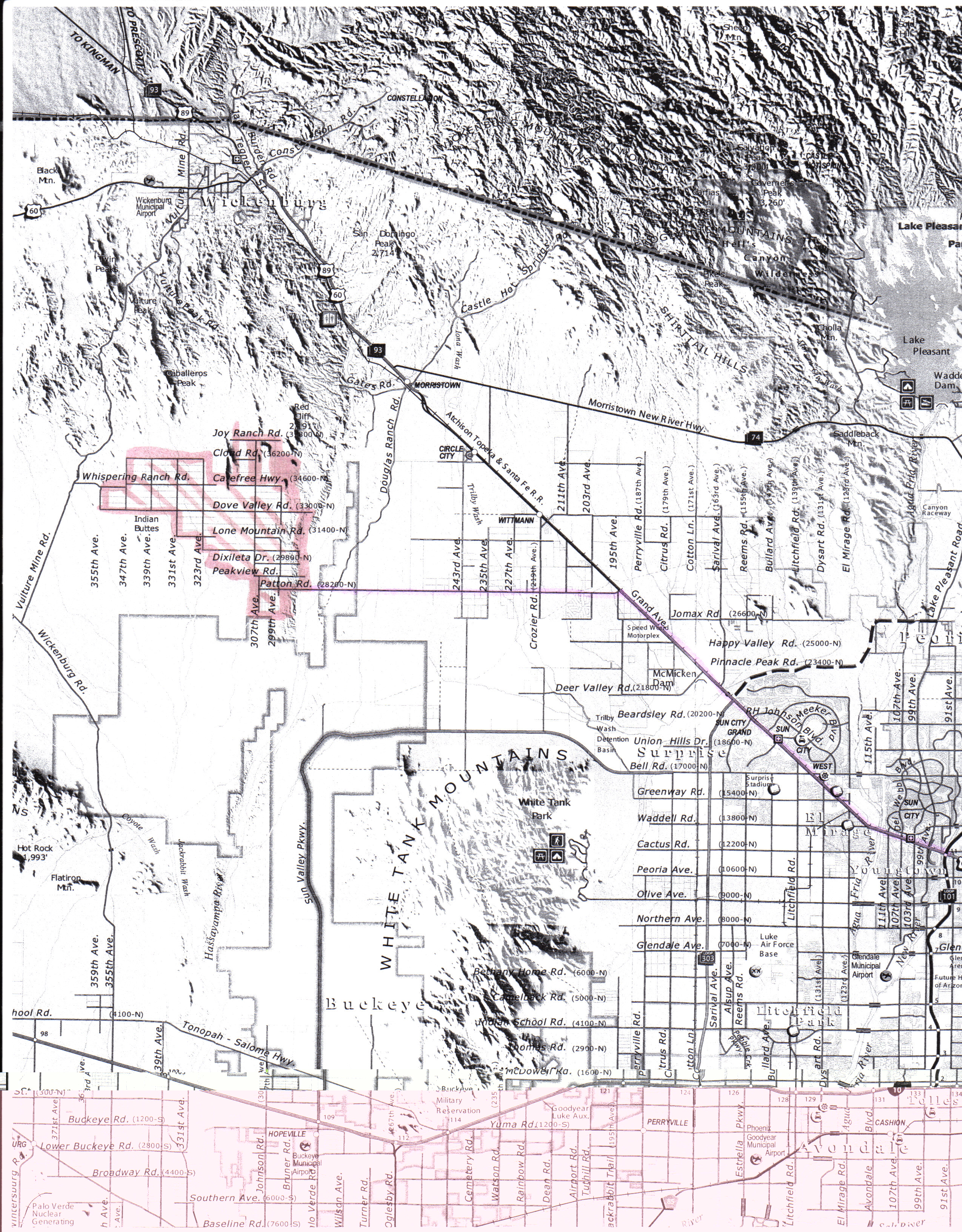 The 110 square mile (70,000 acre) Vulture Mountain Regional Park that borders the north side of Whispering Ranch was announced in January of 2012 by Maricopa County. This area of BLM and Arizona State Trust land parcels will be managed by Maricopa County Parks Department in a situation similar to the White Tank Mountains Regional Park some 20 miles to the south and east. This Regional Park and Preserve area will keep this pristine raw desert area in is natural state complete with camping and recreation areas for future generations to enjoy. Highway74 - which currently stops at Grand Avenue (Hwy. 60) - is planned to run to the west through this preserve area and connect to I-11 in the future.